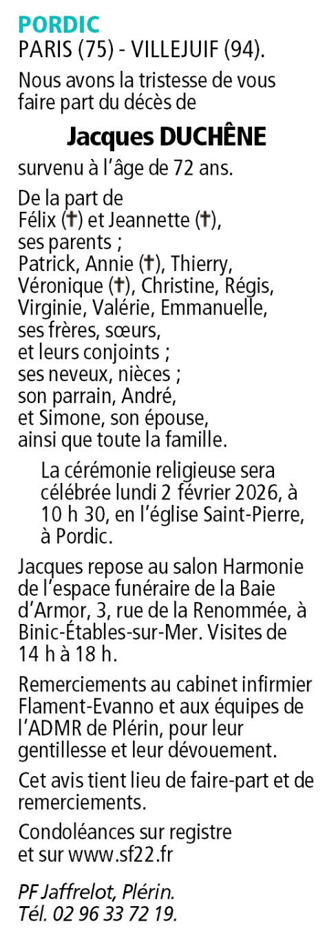 C’est avec une grande tristesse que nous vous annonçons le décès de Jacques DUCHÊNE survenu le mercredi 28 janvier 2026 à Pordic. La cérémonie se déroulera le lundi 02 février 2026 à 10h30 à l’adresse suivante : Église Saint Pierre - Rue Allenou - 22590 Pordic.